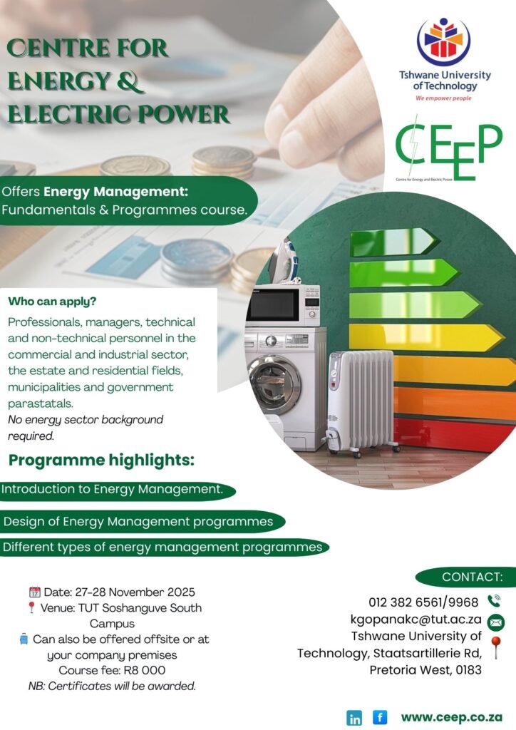 The Centre for Energy and Electric Power is offering 6 short learning programmes in Energy Management, including a 2-day course in Energy Management: Fundamentals & Programmes and a 3-day course in Energy Management: Audit & Economics.